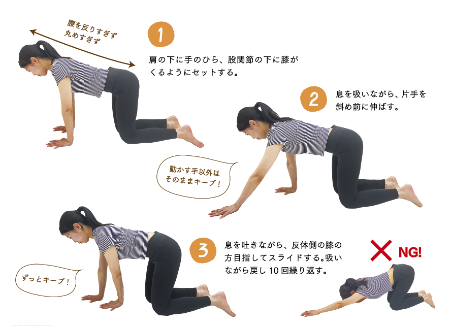 お腹の薄さをキープしながら動くことで、下腹引き締めに役立つ腹膜菌を強化していきましょう!床拭き掃除にもお役立てください♡