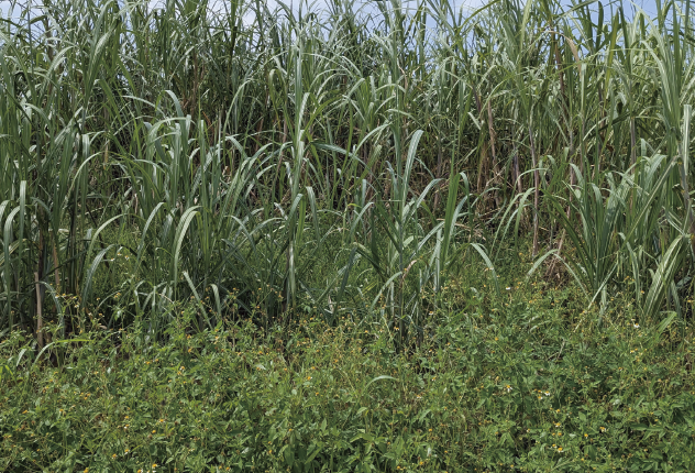 サトウキビ(写真上部)とコシノシロバナセンダングサ(写真下部)
