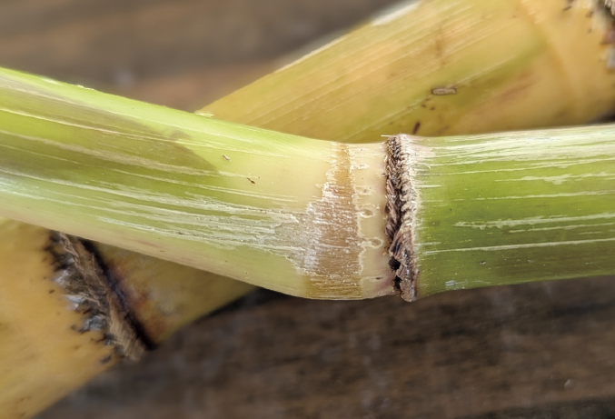 サトウキビが節の部分で屈曲している様子